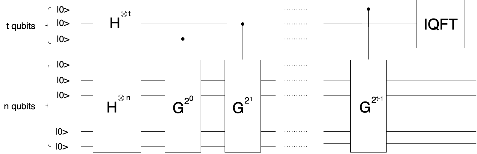 The circuit consists of two registers, one has t qubits and the other has n qubits. It is as follows