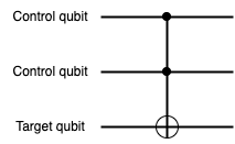Toffoli gate: also known as the CCNOT gate, assigns two qubits as control qubit and another qubit as target qubit. The target qubit flips when both control qubits are in the state |1>, and otherwise the target qubit remains unchanged.